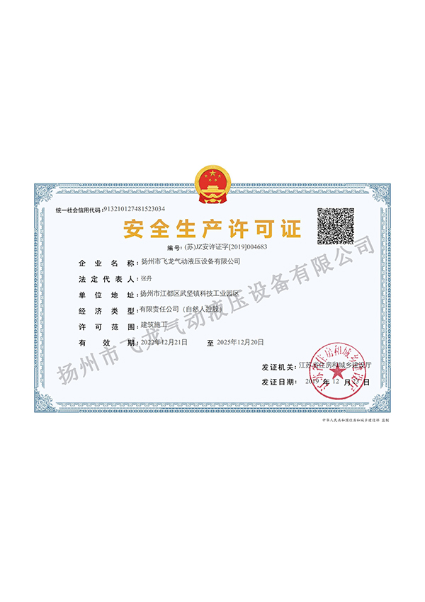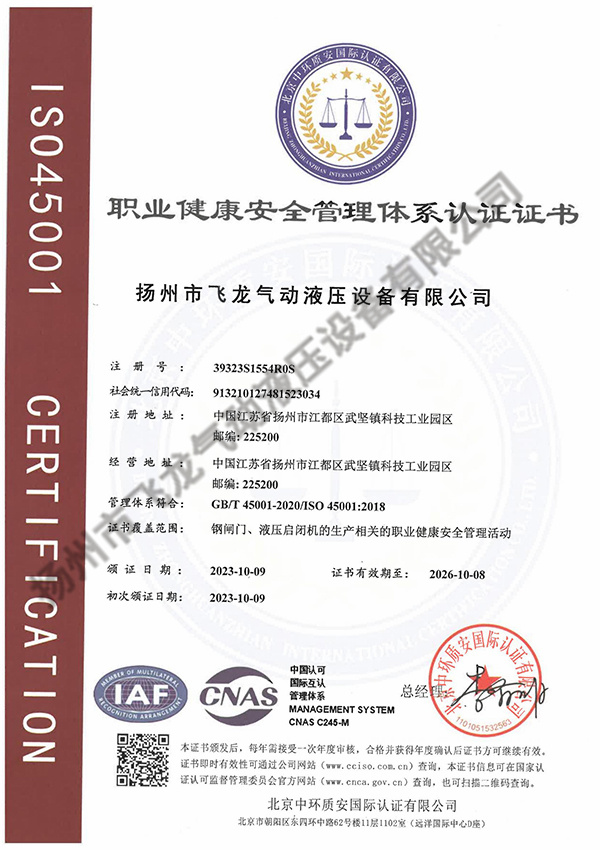揚州市飛龍氣動液壓設備有限公司,通過ISO9001質量管理體系認證、ISO14001環境管理體系認證、OHSAS18001職業健康安全管理體系認證。公司為中國電建市政建設集團江浙生產基地、國家高新技術企業、全國水利建設市場信用AA等級、中國水利企業協會會員、銀行資信AAA等級。擁有水利部水工金屬結構防腐蝕專業施工能力證書、省住建廳安全生產許可證及水工金屬結構制作與安裝工程專業承包貳級資質。